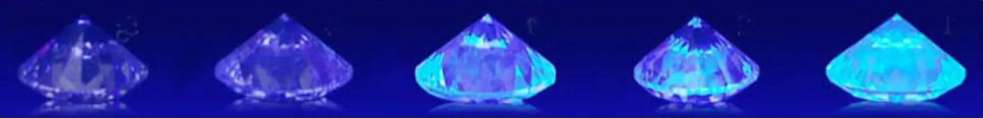 To Measure Fluorescence Diamonds Are Exposed To Ultraviolet Light. This Light Will Indicate The Extent Of Fluorescence In Diamond. The Pictures Below Show The Different Grades Of Fluorescence. We Grade Fluorescence By Comparing With Fluorescence Masters For Accurate Results